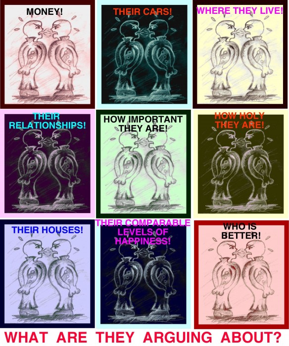 There are all kinds of things which people use to compare themselves against each other with, and they often end up getting into competitive arguments over these things. These include how much money they make, what kind of car they drive, what neighborhood they live in, the kind of house they live in, who is holier or happier than who, and many other things. The image here shows but a few – it seems that people always find ways by which to compare themselves against each other, and see who’s better than who. I’m sure you can find a lot of other things that are argued over, in a comparative, status-conscious context: