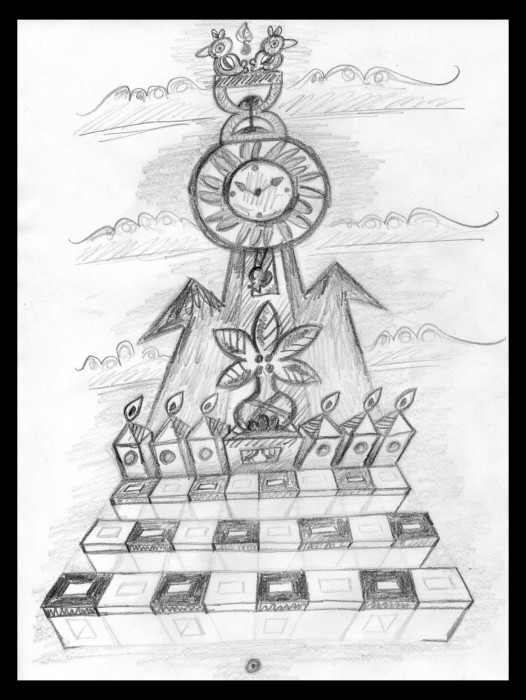 …And, based on the images contained in the above composition, I came up with the following image (I was looking at the above image on the computer screen, and drawing the new image on a piece of paper on my desk):